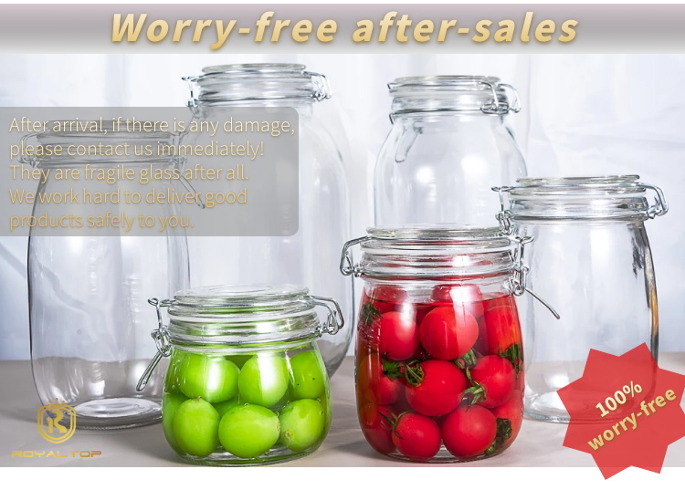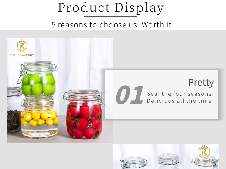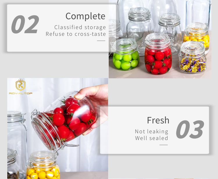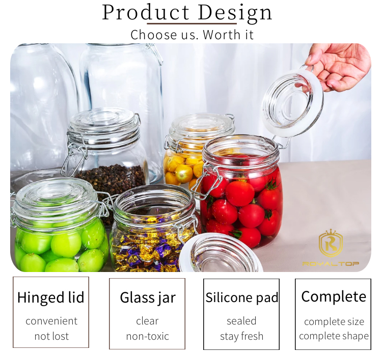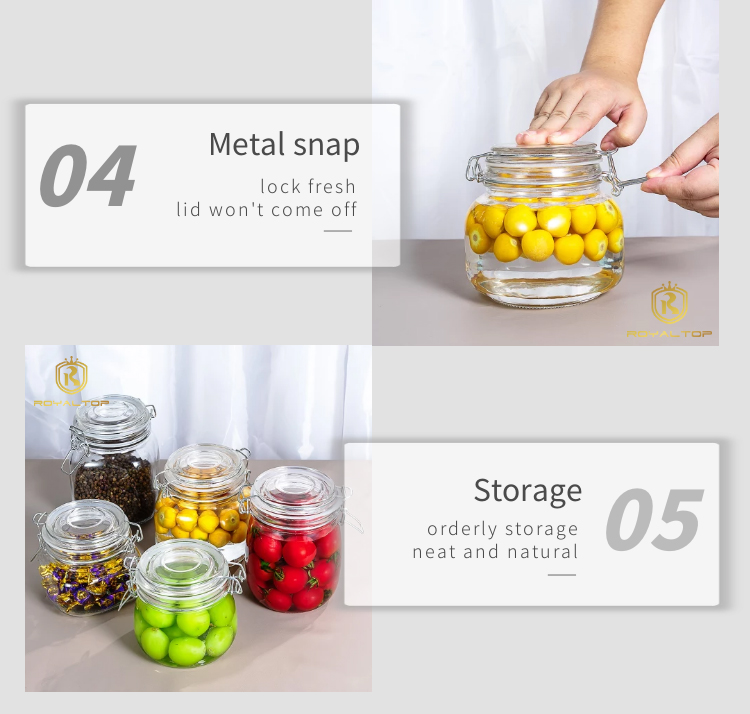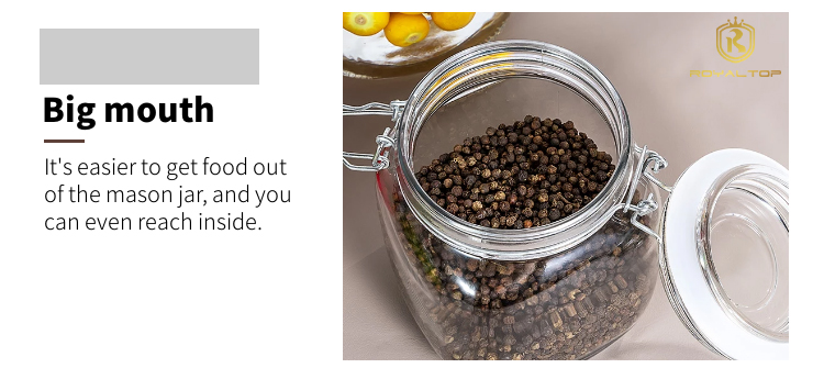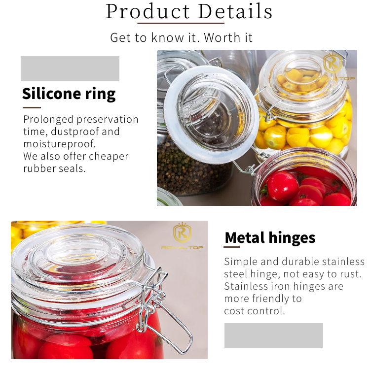 2. High-quality sealing: Our glass mason jars use stainless steel hinged lids and silicone seals, which are effectively leak-proof, moisture-proof, rust-free, and more durable. If you are strict on cost control, stainless iron hinges and rubber seals are a better choice.